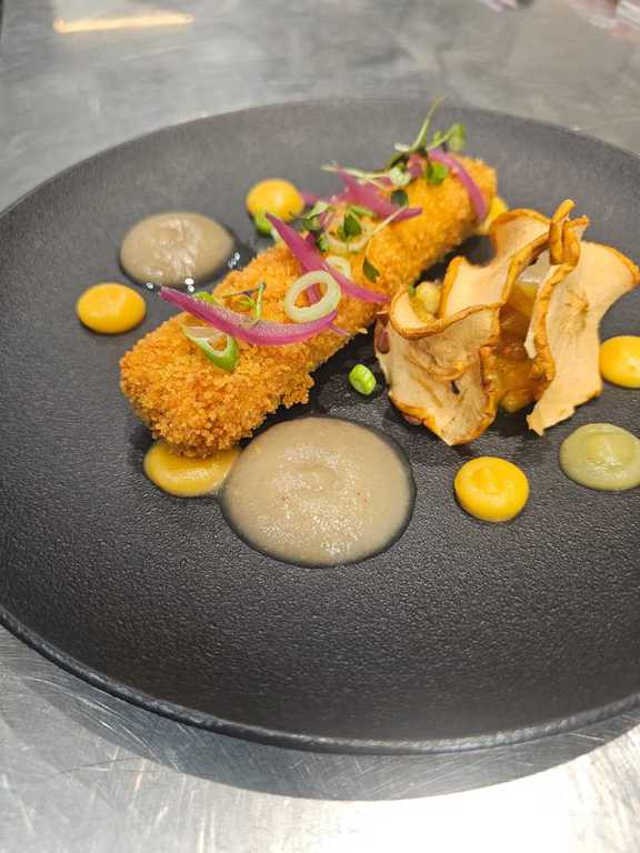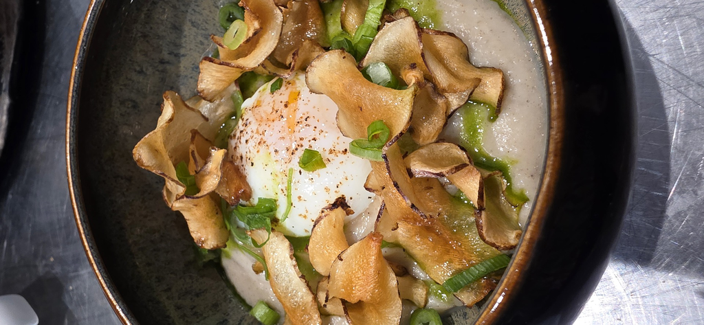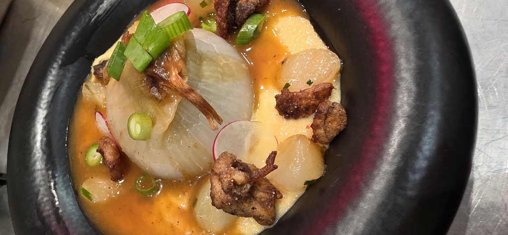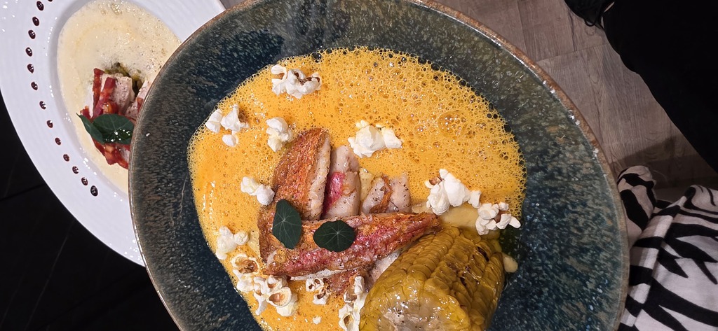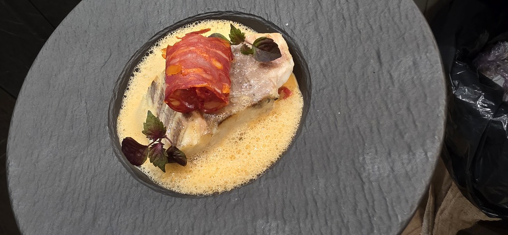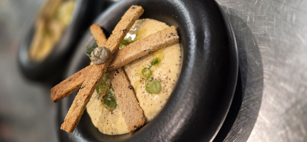 crème et ragout de pois cassé au chorizo, beurre citronné au gingembre